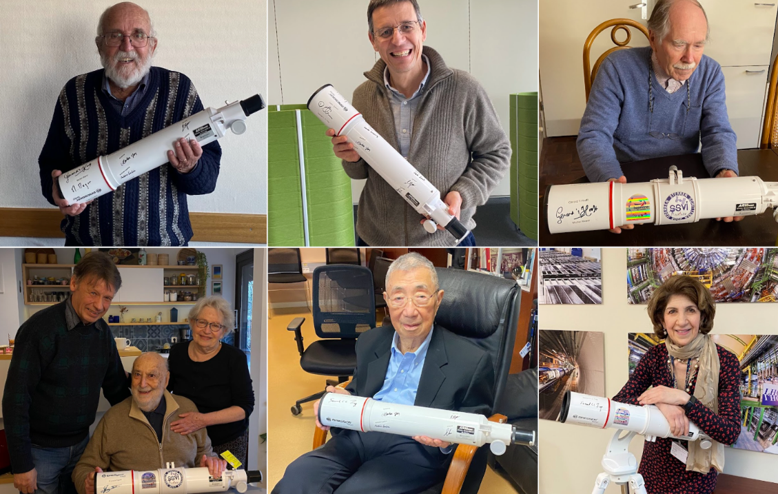 El premio, además del reconocimiento, incluía unas chulas camisetas del concurso, los diplomas y un telescopio muy especial para seguir divulgando con él. Y digo muy especial porque está firmado por nada menos que cinco Premios Nobel de Física (Michel Mayor, Didier Queloz, Gerardus ’t Hooft, François Englert y Samuel Ting), por Fabiola Gianotti (la directora general del CERN) y el equipo de BL4S.