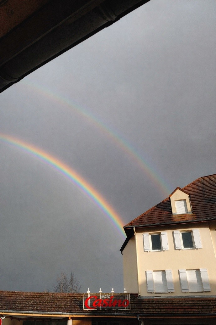 Es de dominio público que Suiza, y en concreto Ginebra, es un lugar realmente caro. Hablando con alguna gente muy maja que conocimos en los pasillos, descubrimos que se podía cruzar fácilmente la frontera a Francia. Existía un pequeño pueblecito donde la vida parecía más asequible. Así pues, en una de las tardes libres nos aventuramos a explorar los alrededores. Con la montaña al lado era irresistible no subir por algún sendero perdido. Sin rumbo, fuimos charlando sobre aquello que nos hacía diferentes y, al mismo tiempo, iguales. Sin darnos cuenta, la llovizna de la tarde y los últimos reflejos de sol habían creado un arcoíris doble enorme: un fenómeno que no cualquiera sabe reconocer y entender como nosotros.